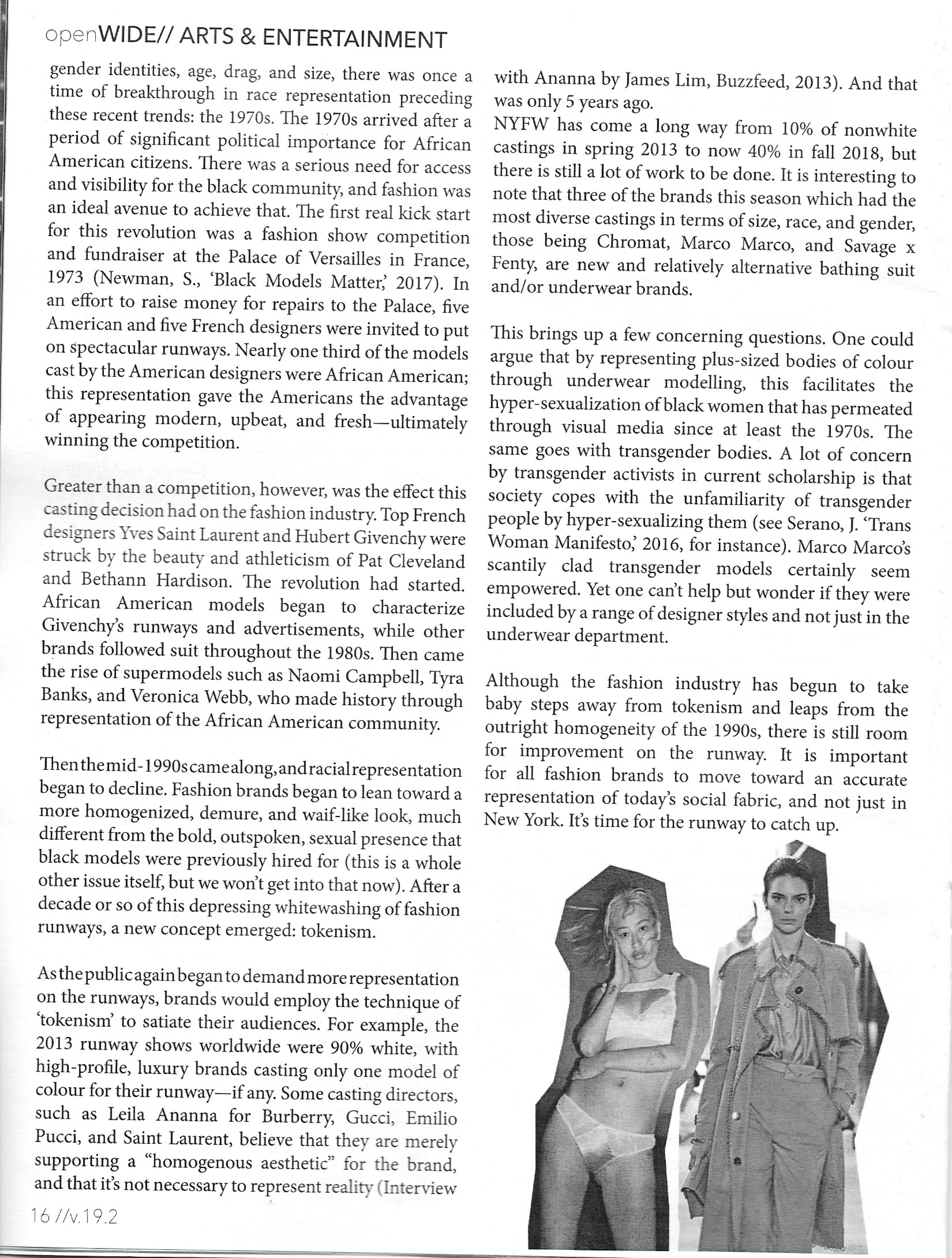 As the public again began to demand more representation on the runways, brands would employ the technique of ‘tokenism’ to satiate their audiences. For example, the 2013 runway shows worldwide were 90% white, with high-profile, luxury brands casting only one model of colour for their runway—if any. Some casting directors, such as Leila Ananna for Burberry, Gucci, Emilio Pucci, and Saint Laurent, believe that they are merely supporting a “homogenous aesthetic” for the brand, and that it’s not necessary to represent reality (Interview with Ananna by James Lim, Buzzfeed, 2013). And that was only 5 years ago.